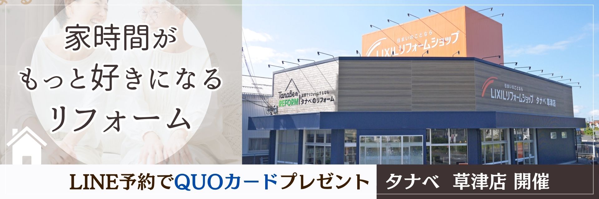 LIXILリフォームショップ タナベ 東近江店は、LDKやユニットバスやトイレの空間を展示しており、打合せの折にはリフォームの実際の広さや間合いの取り方が体感していただけるショールームです。お客様の「暮らし」と「思い」に触れ、「ずっと暮らしたい家」づくりをサポートします。