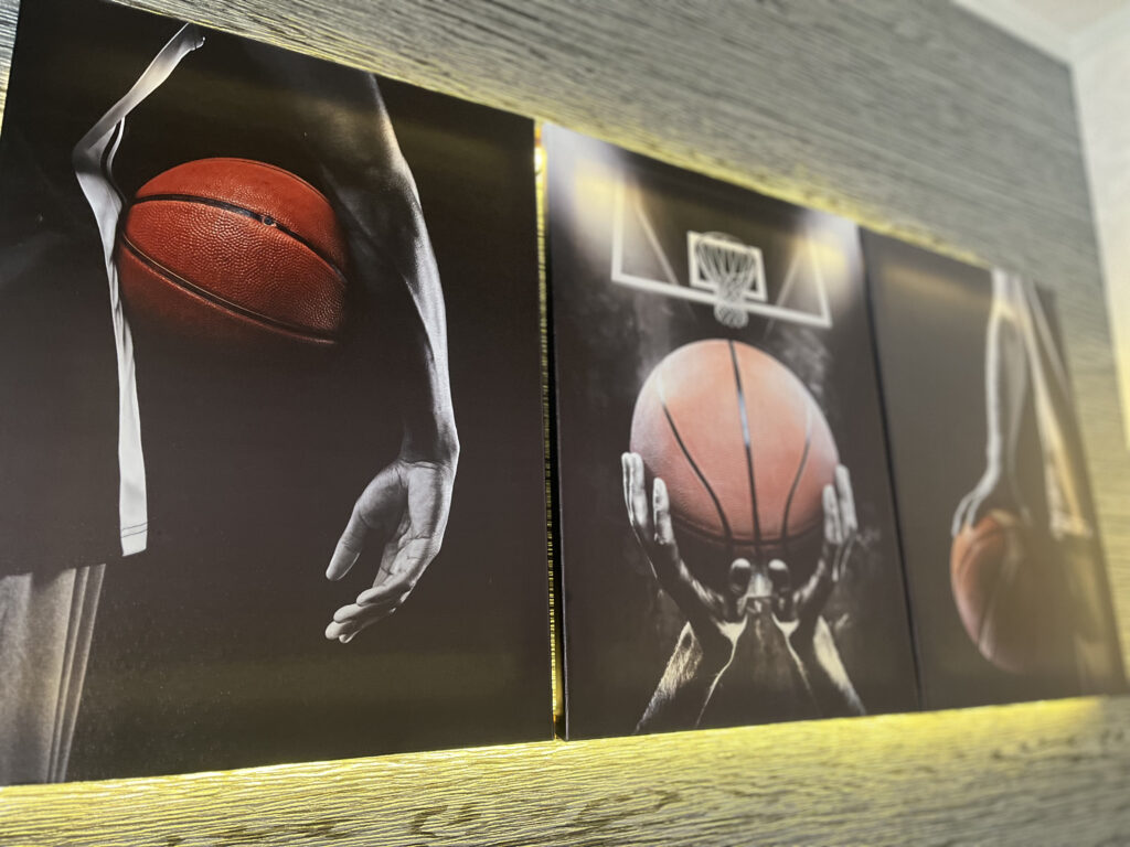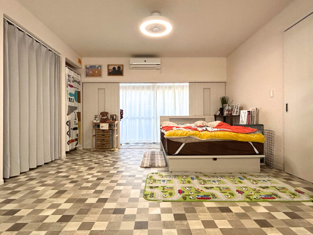 部屋に圧迫感が出ないように扉ではなくカーテンで物入を仕切りました。スイッチ類もまとめ、人感センサーやリモコンを用いて空間をすっきりと。