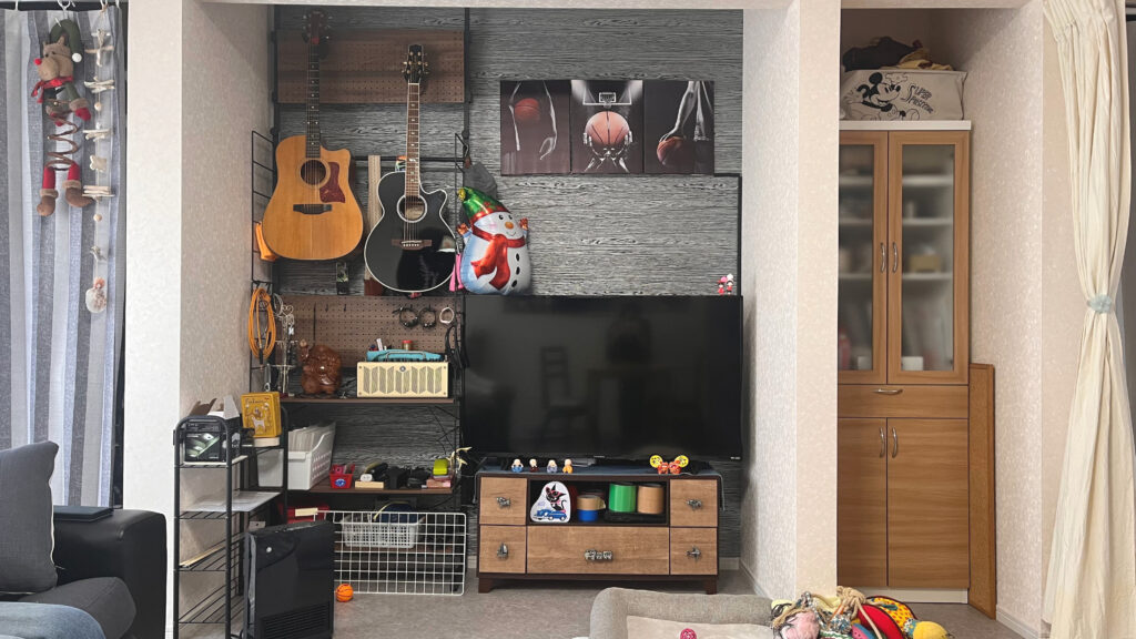 物入と押入れだった空間はテレビを配置するためのスペースを優先で確保し、カーテンで隠すことのできる収納へ。あえて扉は付けていません。