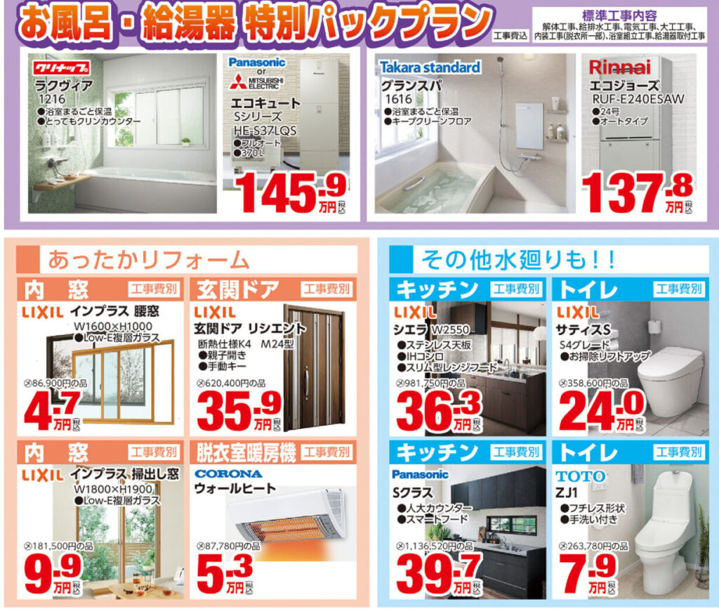 浴室+洗面リフォームや浴室+給湯器のお得な限定パックプランもございます。