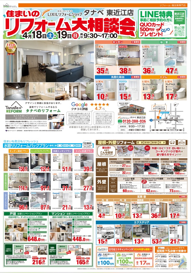 LIXILリフォームショップタナベ東近江店では、4.18(土)~4.19(日)