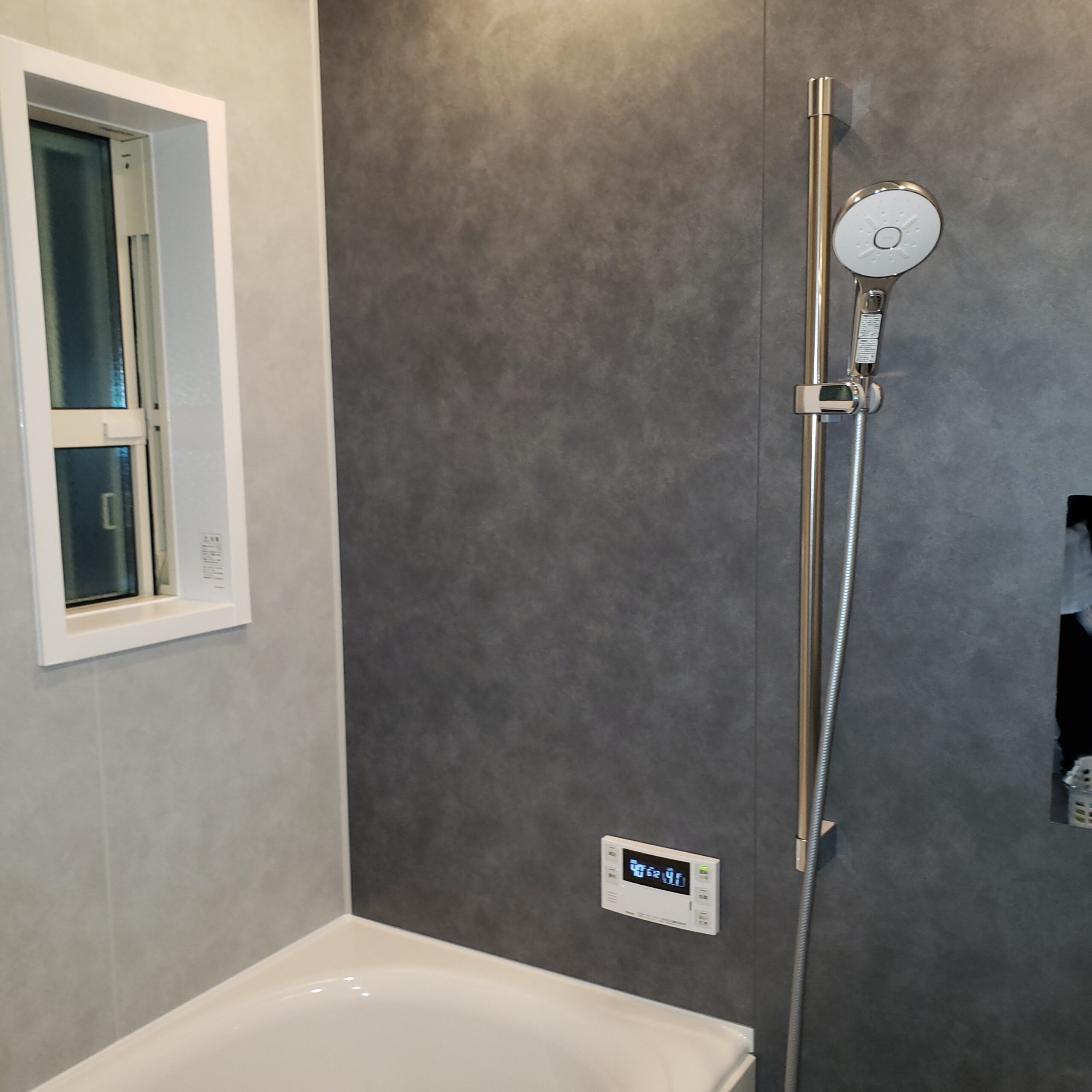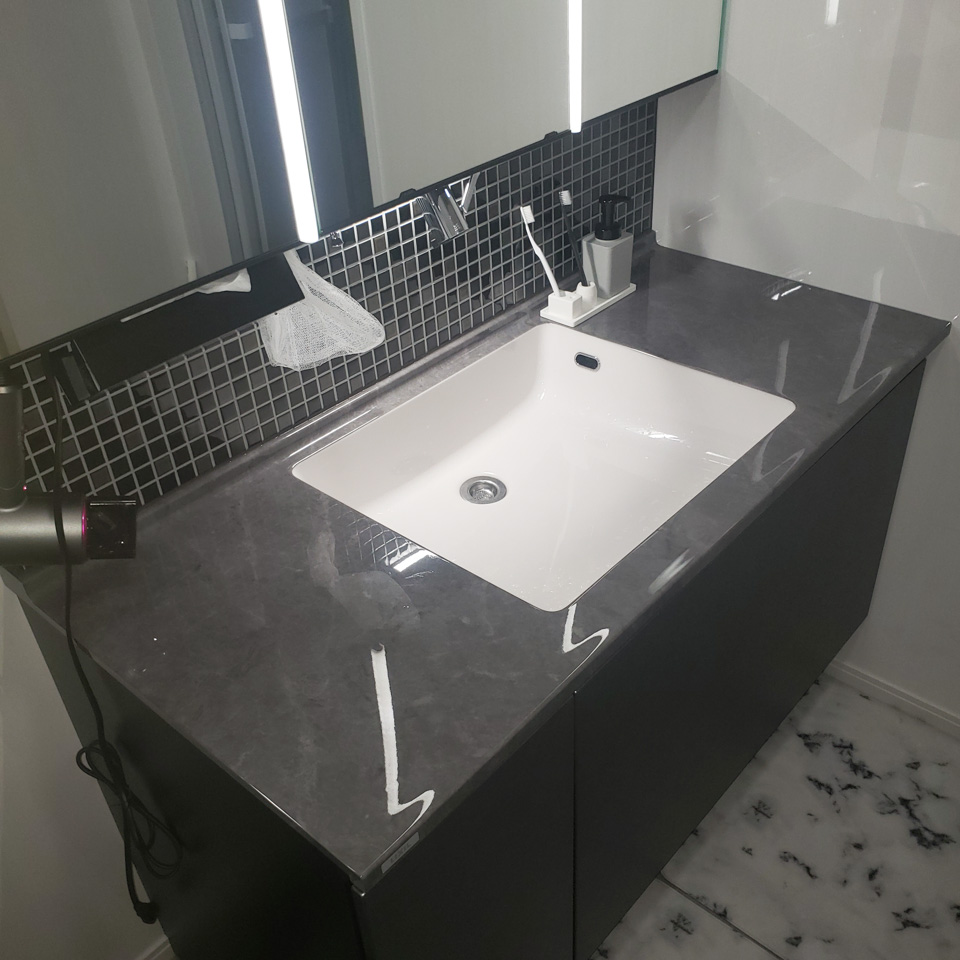 住器は全てリクシルの商品をお選びになられました。全体的にグレーでまとめられた締まりのある大人っぽい雰囲気の水廻りです。